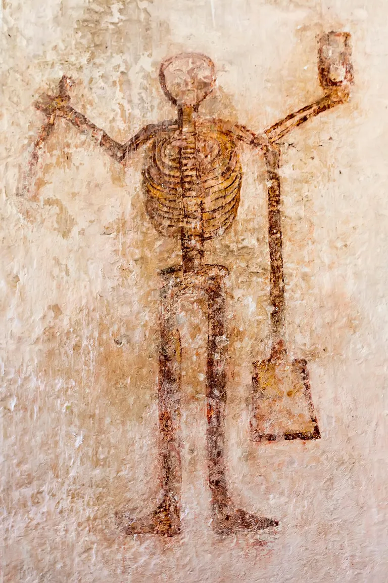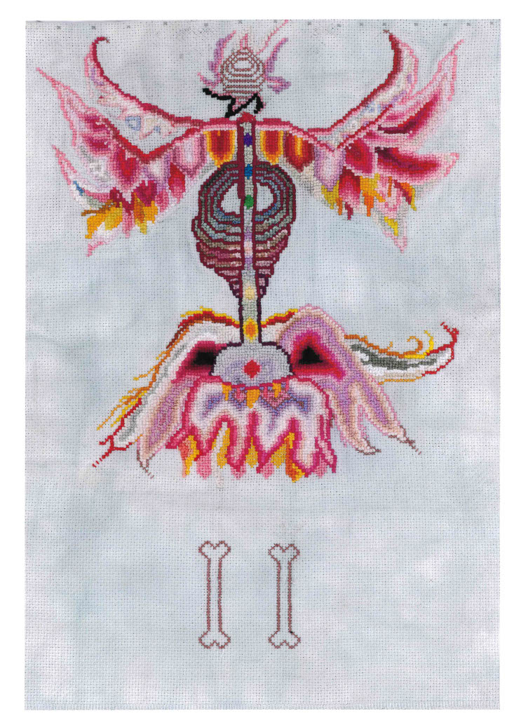 Lunaria, cross-stitch embroidery, 2025, inspired by medieval wall painting of Time (or Death), in Patricio (Partrishow) church of St Issui, Powys.