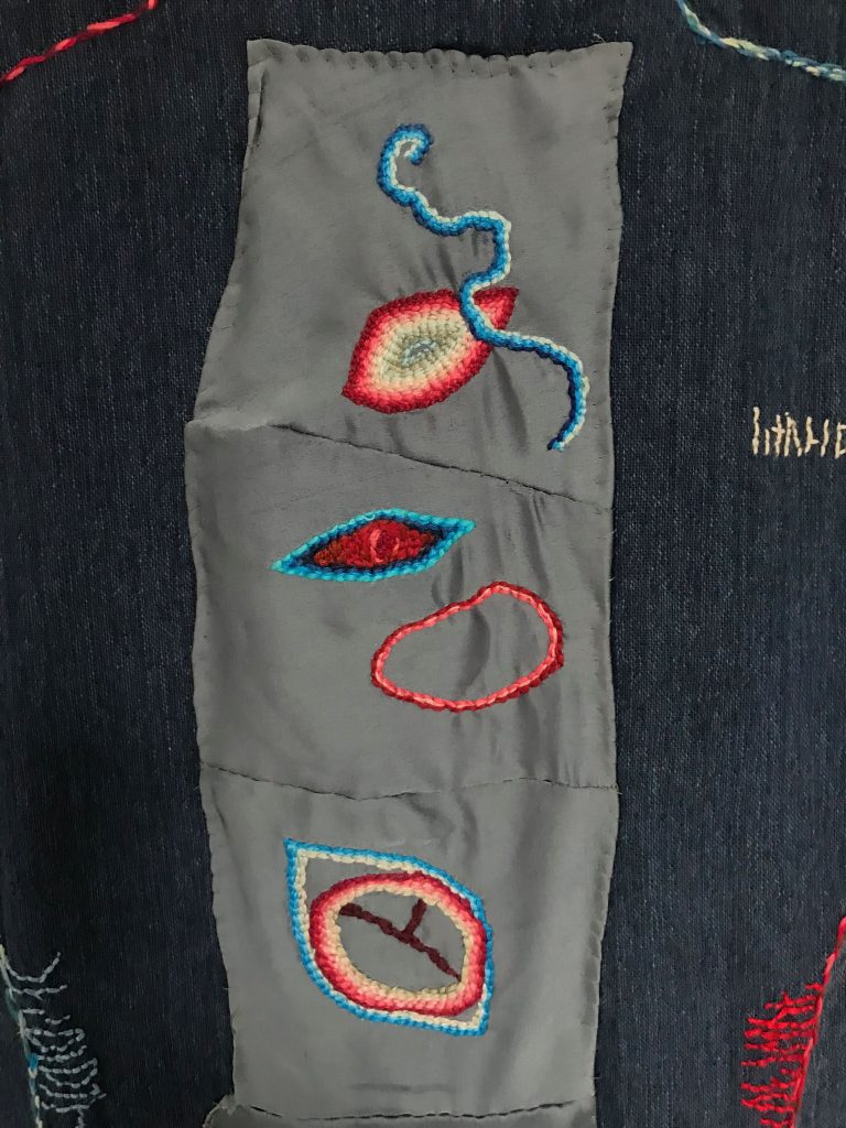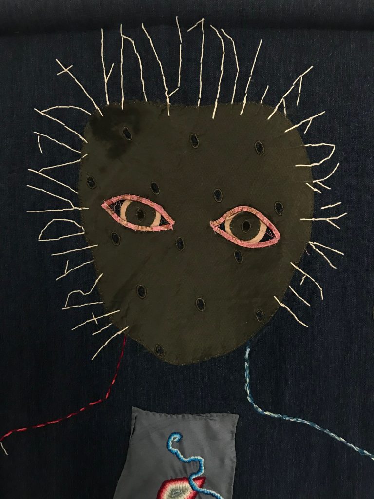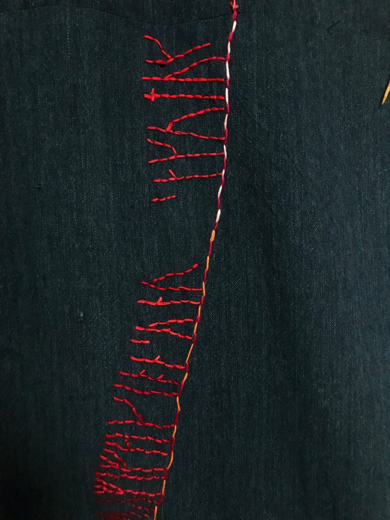 Life-sized bog woman/yeti protector, hand-embroidered on Japanese sashiko fabric, featuring ninth century runes from the Rök runestone, 2024.
